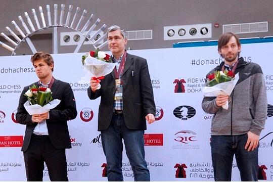 Em 2016 foi campeão mundial de rápidas, deixando em segundo lugar Magnus Carlsen. como você vê na imagem abaixo. Esse podium tem uma história engraçada, pois ele estava recebendo esse prêmio e pensando em uma partida de damas que ele jogava, então recebeu o prêmio e saiu correndo terminar a partida de damas.